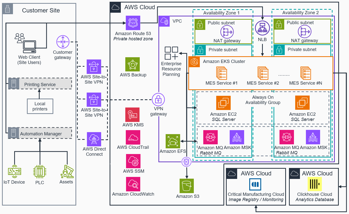 The following architecture diagram shows how the Critical Manufacturing MES can be deployed on AWS cloud infrastructure, including, among others, the kubernetes cluster for the application servers, SQL Server database, and external services such as Rabbit MQ and ClickHouse.