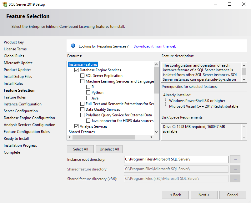 The next picture shows the Feature Selection screen for SQL Server. It represents the features required by Critical Manufacturing.
