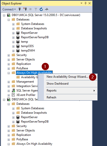 Then, go to the Always On High Availability folder and right click on it to start the New Availability Group Wizard: