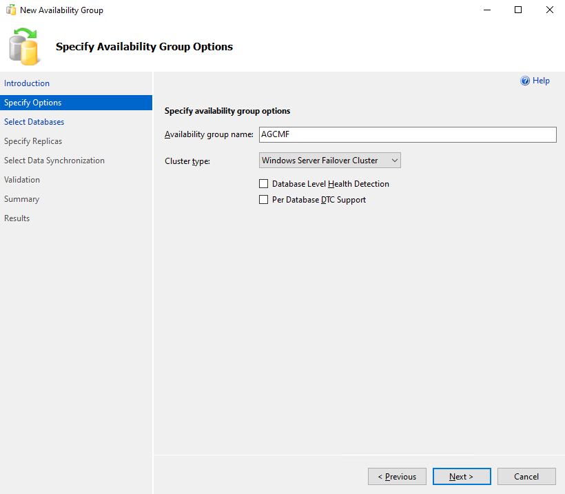 After this you must select the name of the Availability Group. In this case the system will be called CMF and three availability groups will be created (Online, ODS and DWH). According to the guidelines, the names will be AGCMF, AGCMFODS and AGCMFDWH:
