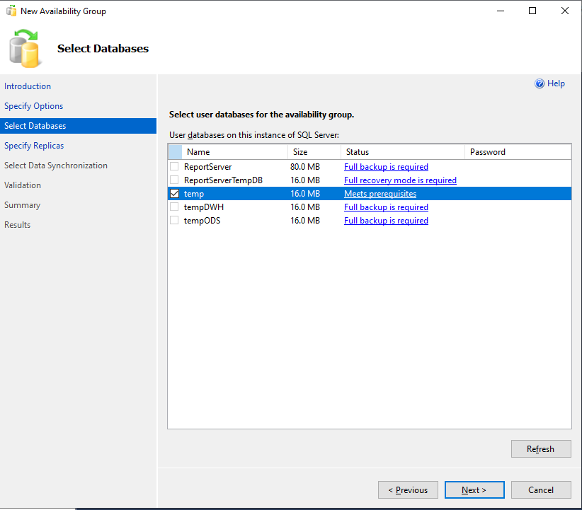 Create a temporary database for each planned Availability Group. If you want to create an Availability Group for Online, ODS and DWH, you need to create 3 temporary databases.