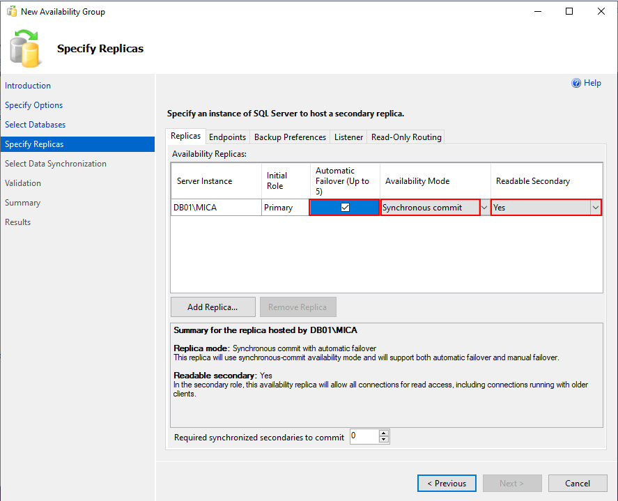 The port and IP Address must be selected according to the available values. Do not forget that the listener will be the public address of the Availability Group. Therefore, this will be the value that you will use when preparing the database server in the MES setup: