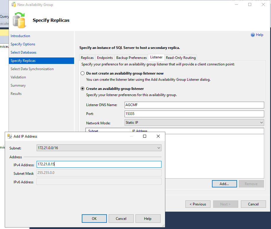 It is also possible to create the listeners for each Availability Group. Follow the guidelines and give the listener the same name as the Availability Group. Hence, the listener will be named AGCMF: