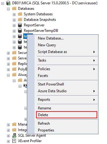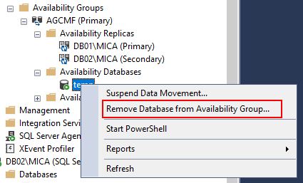 After creating the Availability Group, you can delete the temporary database. First remove the database from the Availability Group: