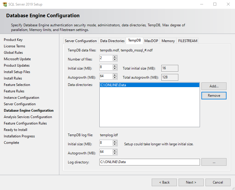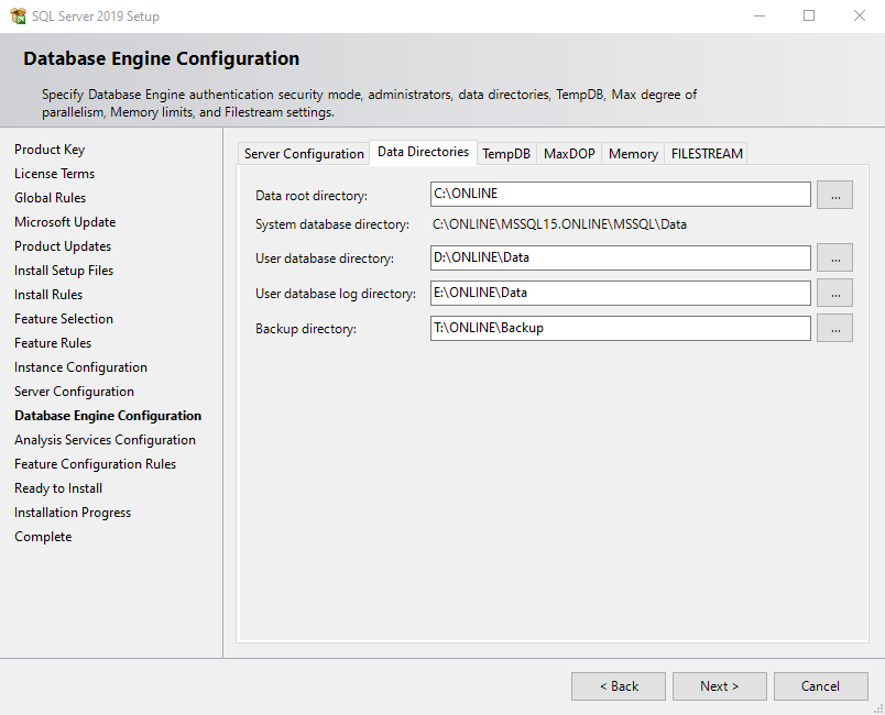 Now configure the data directories. Critical Manufacturing recommends separating the data files and at this moment you should have already prepared the disk drives on all nodes.