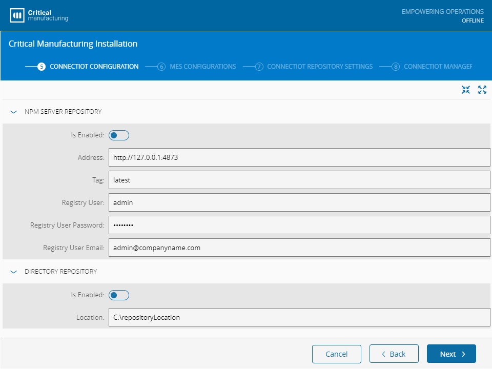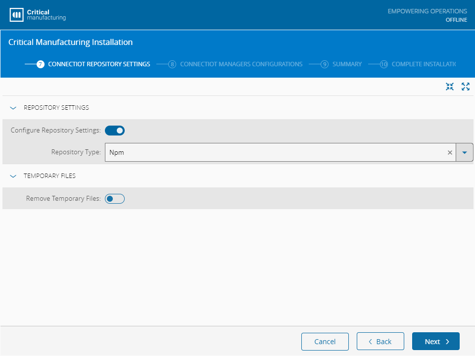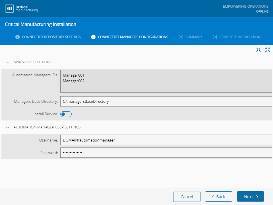 While this method provides a direct installation method for Connect Iot, Critical Manufacturing recommends using the automatic deployment method, which you can read about in Configure Automation Manager Deployment.