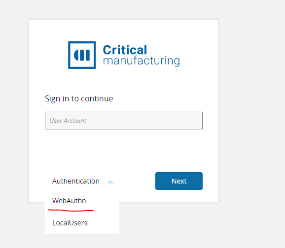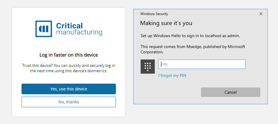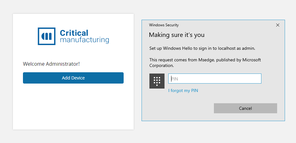 If a user is accessing the MES system using a browser that they had already registered as a WebAuthn authentication device, steps 1 and 2 are performed automatically by the system with no need for user interaction. In this scenario, the Windows Hello window is automatically displayed to the user and they only need to validate their device in order to access the MES interface.