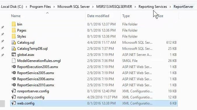 Go to the ReportServer sub-directory where SQL Server Reporting Services is installed. In this example, the path to the ReportServer directory is C:\Program Files\Microsoft SQL Server\MSRS13.MSSQLSERVER\Reporting Services\ReportServer: