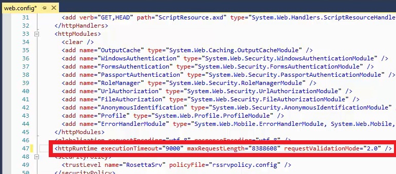 Open the web.config file with a text editor such as Notepad or Visual Studio. Search the web.config file for httpRunTime and add maxRequestLength with a file size in bytes. In this example we are setting the maxRequestLength to 8388608 which is 8 MB. Save the web.config file: