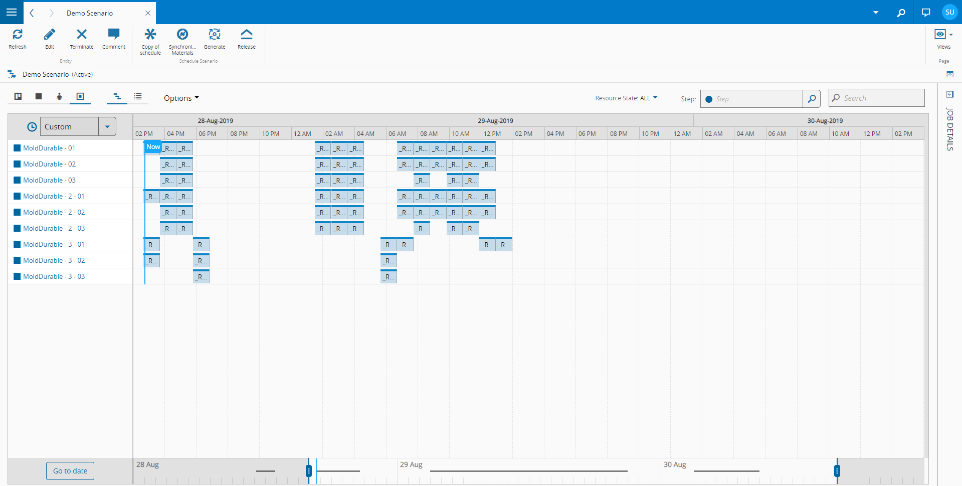 If durables are a constraining factor in the production process, given these considerations or others, it may become important to include them in scheduling. Scheduling supports durables scheduling, in other words, constraining the operations execution to when both the required Resource and durables are available.