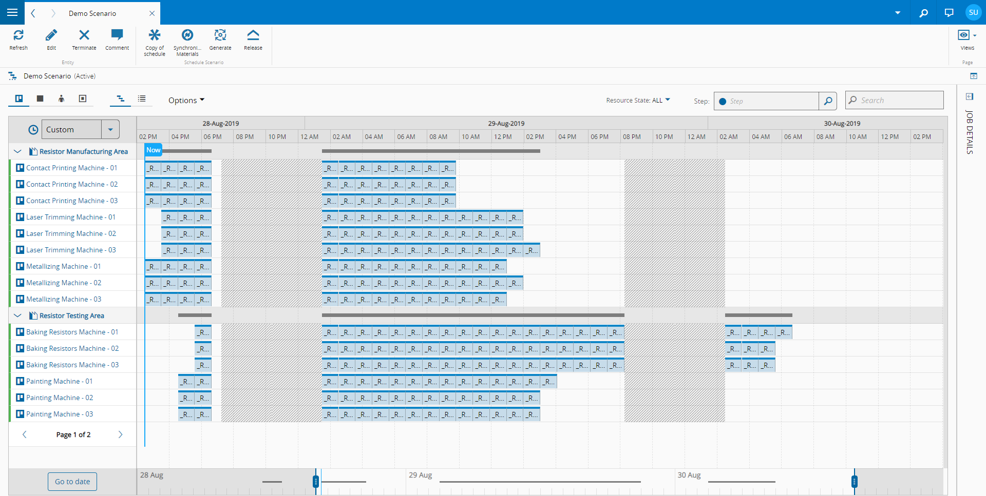 The Resource property Can Process in Non-Working Time allows for a Schedule Scenario Job to continue its execution or finish it during non-working periods; however, it still cannot start in a non-working period. This aims to model cases where machines have pre-set switching-off timers, and therefore do not require human intervention to process, for example industrial ovens with switch-off timers. As such, even though one or more non-working periods may be crossed, the Resource is kept operating.