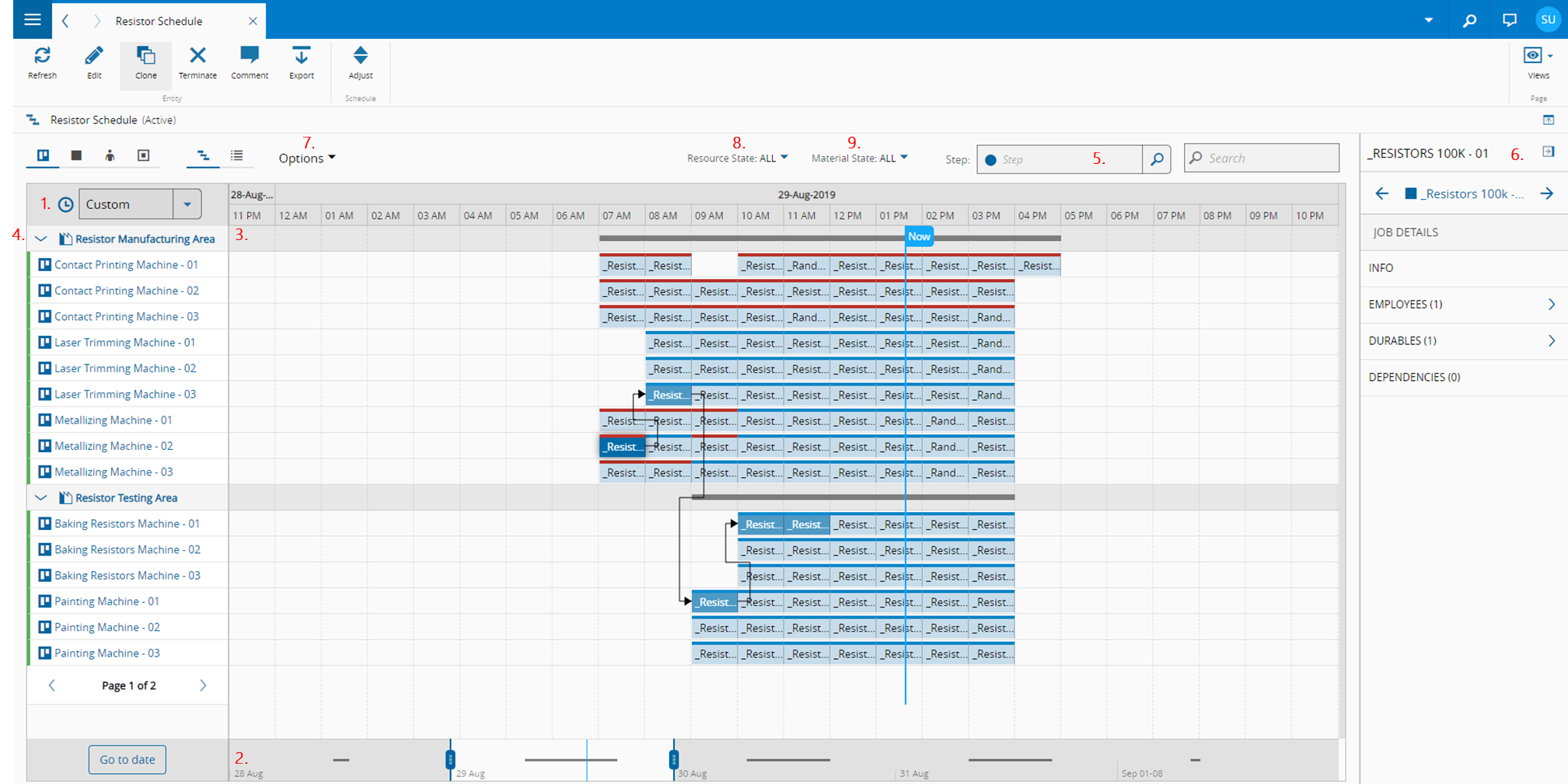 By clicking on the Schedule Scenario Job, the same information becomes available on the right-hand side panel, on the Details tab (6.). This tab also shows information about existing relations to Tools (Durables), Employees or Dependencies that the Schedule Scenario Job may have.