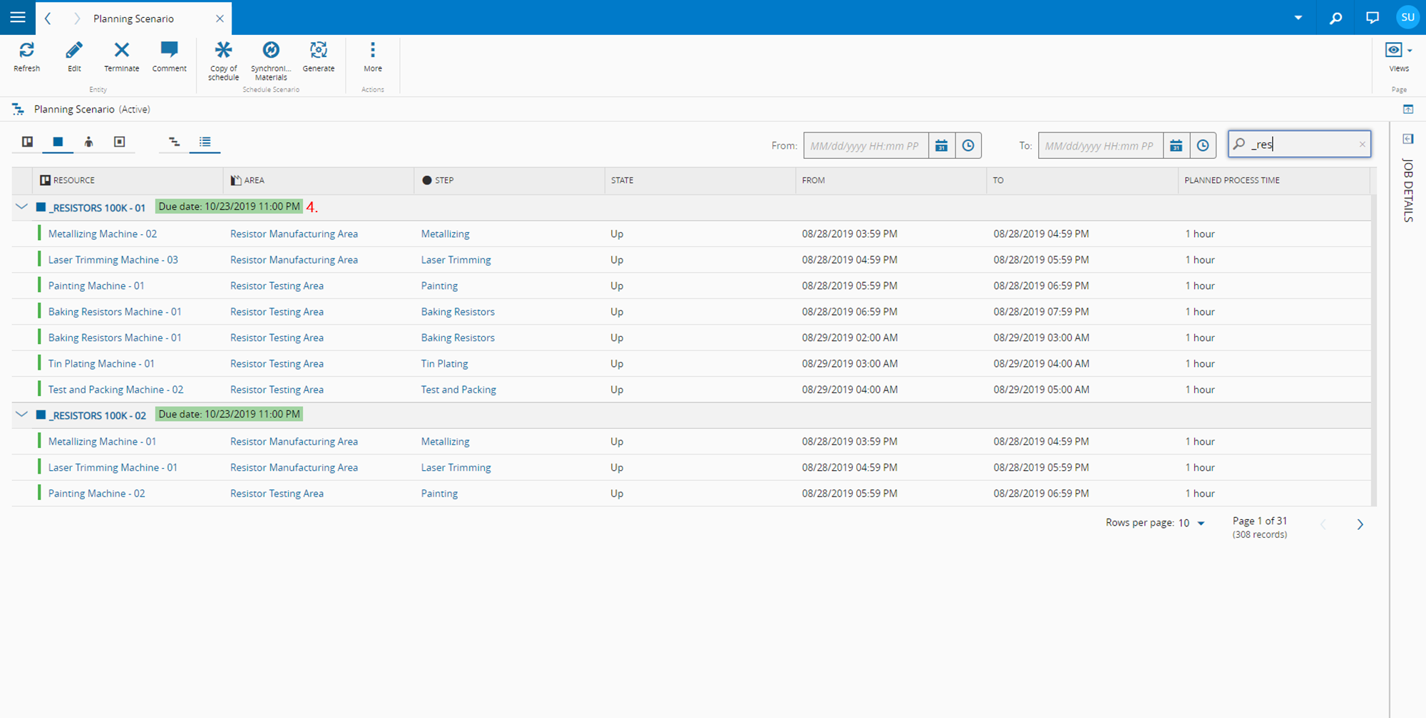 - The Resource view, which shows the Schedule Scenario Job (remaining Steps to be executed for each Material) allocation for each equipment. This can be helpful in determining the load allocation in critical resources in the system.