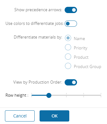 In terms of visibility, there are three extra filters available. The Options filter (7.) besides allowing to hide/show the precedence arrows previously described, also allows to color-code the Schedule Scenario Jobs according to four different criteria: