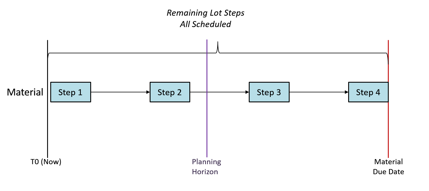 The operational accurate scheduling mode, schedules all the remaining Steps for the (real) Materials based on their current position in the Flow Path. As long as one of the Jobs falls within the planning horizon, the system will try to schedule always all the Jobs for the Material, even if it falls beyond the Planning Horizon.