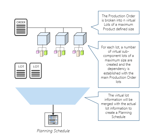 The planning mode aims at taking a longer term approach to scheduling, taking into account not only the existing WIP in the form of Materials in the shop floor, but also considering the existing demand, in the form of Production Orders, which have not yet been materialized in the shop floor. For each Production Order which has the property Include in Planning set to true, the system will take any Materials which are not allocated to a Production Order and used them to fulfill the material requirement (if the Product's property Use Stock in Scheduling is activated); if there isn't enough quantity, then it will create a number of virtual materials according to the Maximum Material Size of the associated Product, which will be scheduled in the same way as a real Material. Furthermore, if the Production Order also has the property Include in BOM Explosion activated, and there is a BOM of Scope materials (that is, a BOM for components) which is associated with the BOM context of a Step within a Flow of one of these virtual materials, the system will again take any unassigned quantity for that Product, that is, quantity which isn't reserved through a Material Dependency (if the Product's property Use Stock in Scheduling is activated); if there isn't enough quantity, then it will create as many virtual materials for each BOM Product (component) as necessary to supply this internal demand.