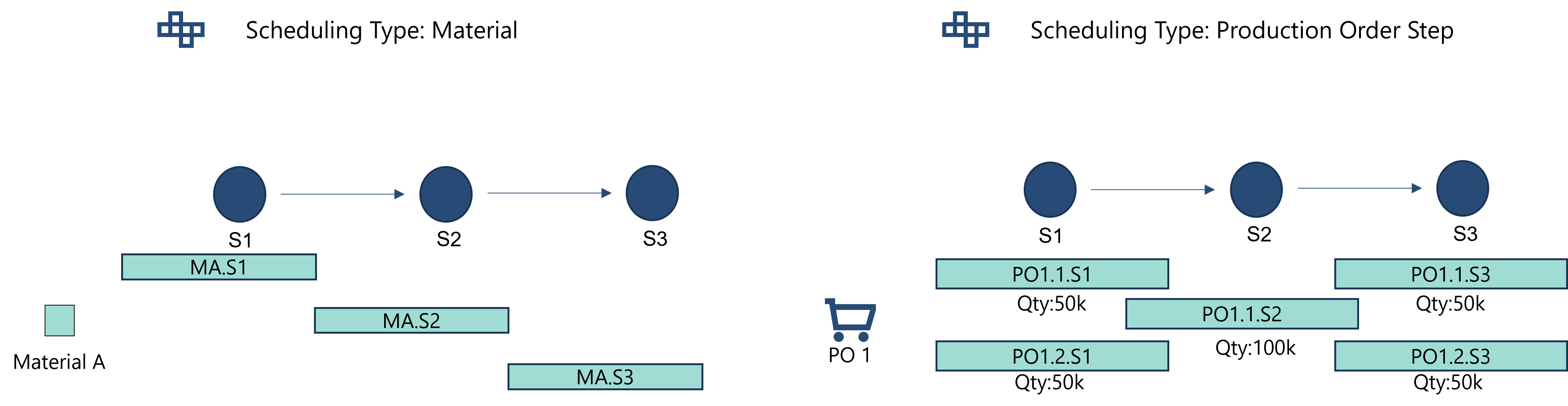Depending on the need to break down a single Production Order into separate Production Order Steps, two different Scheduling Types are available in the system and can be configured at the Product level: