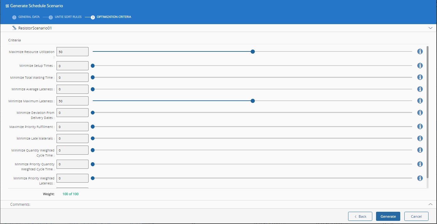 This section describes the different Optimization Criteria supported by the scheduling engine. Each one aims at fulfilling a certain objective, with this fulfillment being measured by an associated KPI. It is possible to combine more than one of these objectives, using the associated weights to give relative importance between criteria (either defined by default in the Create Schedule operation, or specified at the Schedule Scenario level, during the Generate Schedule Scenario). Keep in mind that the sum of all weights must equal 100%. It is advisable to limit the criteria mix to a maximum of two/three, to preserve the integrity of the results obtained.