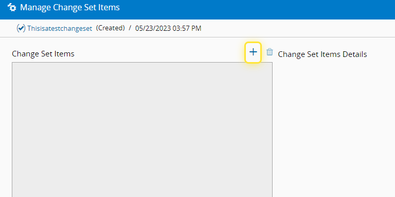 5. Under the Change Set Items tab, select + to add a Change Set Item.#