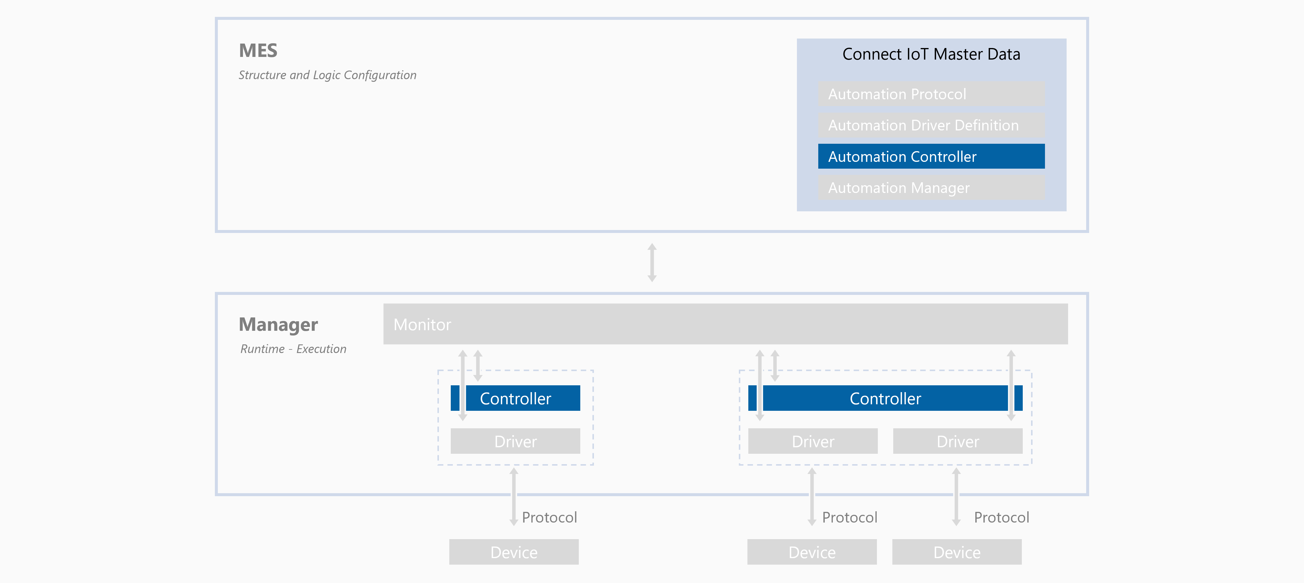 A controller may depend on several different drivers. For example, a machine that has an integration for the conveyors and for the machine itself both may have completely different drivers and protocols, but the controller will be the process that will orchestrate and manage them.