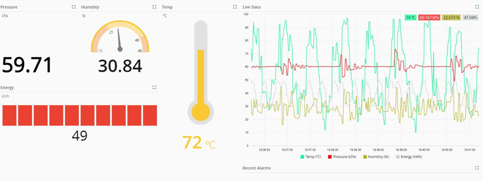 In this example we are setting up the Live Data Widget with an X scale of 2 minutes and Y scale from 0 to 100. The widget will fetch the information to display in the X axis from the property AppProperties.EventTime and the information to display in the Y axis from the property Data.