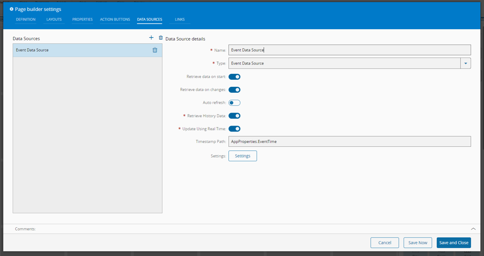 To set up an event data source in the UI Page editor, go to the Data Source tab in the UI Page settings: