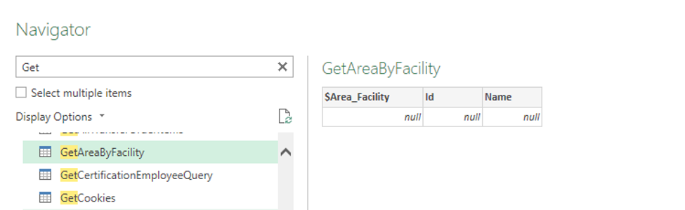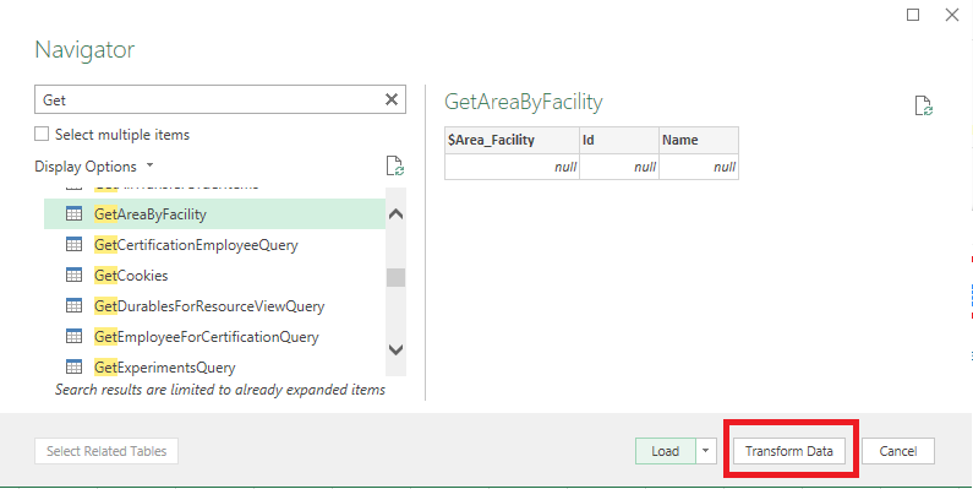 Now that the parameter value is known, you can select the GetAreasByFacility entity in the Navigator view and select Transform Data: