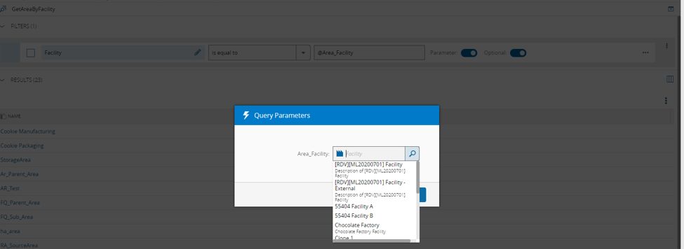 First, you need to know what sort of parameter $Area_Facility represents. In this case we can use the MES UI to try to run the same MES Query: