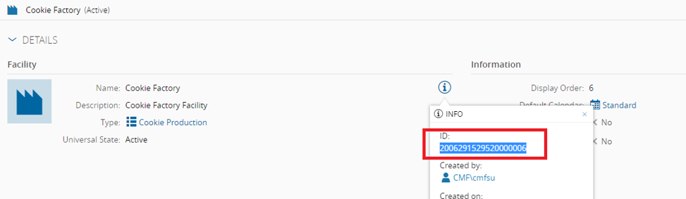 For this example, the target Facility for which you want to retrieve existing Areas is called Cookie Factory. At this moment, the Id of the Cookie Factory Facility most likely is still unknown but can be consulted in the MES UI by simply opening the target Facility and copying from the Info section: