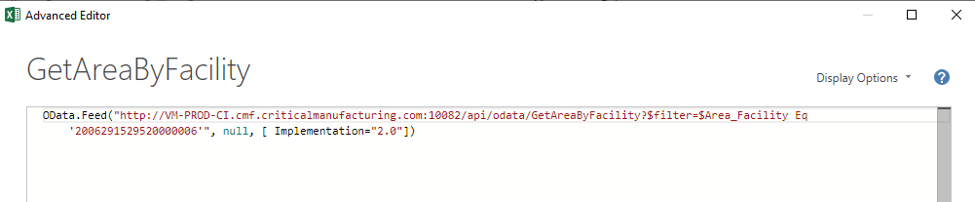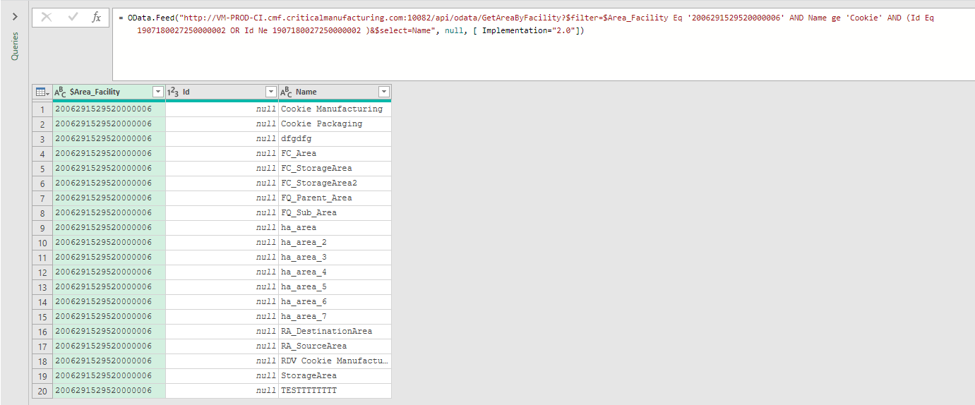 OData.Feed("<http://VM-PROD-CI.cmf.criticalmanufacturing.com:10082/api/odata/GetAreaByFacility>?$filter=$Area_Facility Eq '2006291529520000006'", null, [ Implementation="2.0"])