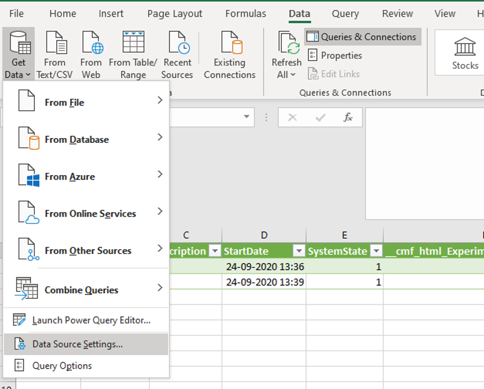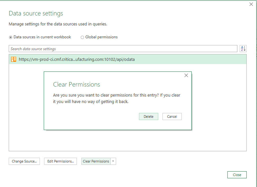 Use the Get Data functionality from the Data menu, as shown in the image above, and select the Data Source Settings option. In the following screen, select the endpoint causing the issue and select Clear permissions. Select Delete in the next dialog to confirm the operation and repeat the connection configuration.