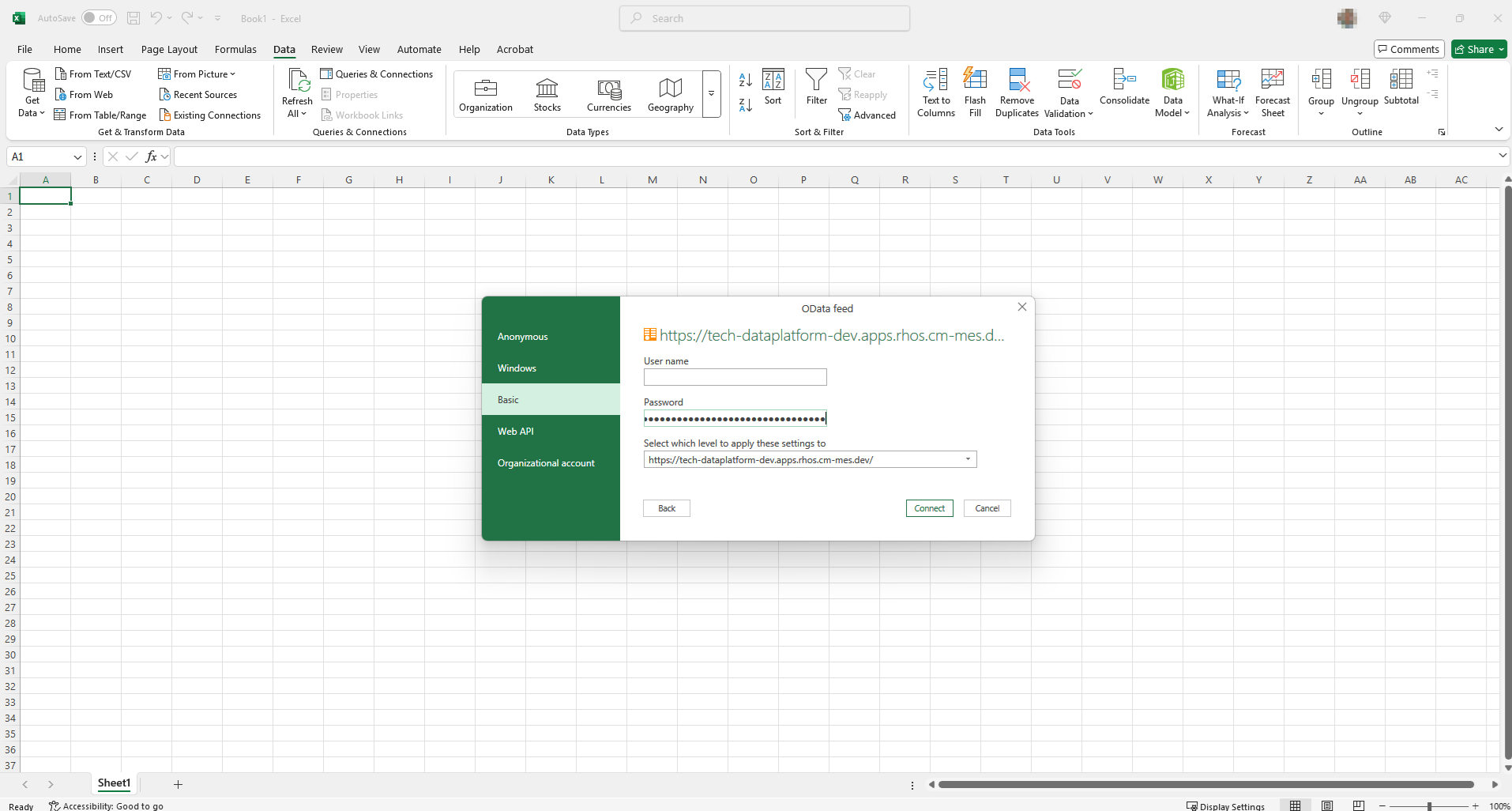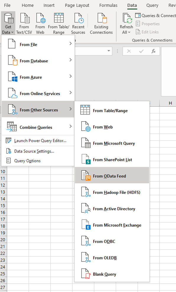 Using Microsoft Excel as an example, and to open the OData dataset, the steps are as follows: