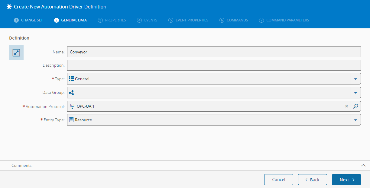 For this particular example, let's imagine a conveyor belt that is connected to the MES system via OPC-UA, with a barcode reader that detects the presence of an item when it passes on a sensor located at the end of that conveyor and writes the scanned value to a property field through OPC-UA. First of all, we should create an object that represents that same connection, in the form of an Automation Driver Definition. Go to the Business Data menu, select the Automation Driver Definition tile and create a new entry. Use a meaningful name and use the OPC-UA protocol created above as the value for Automation Protocol.