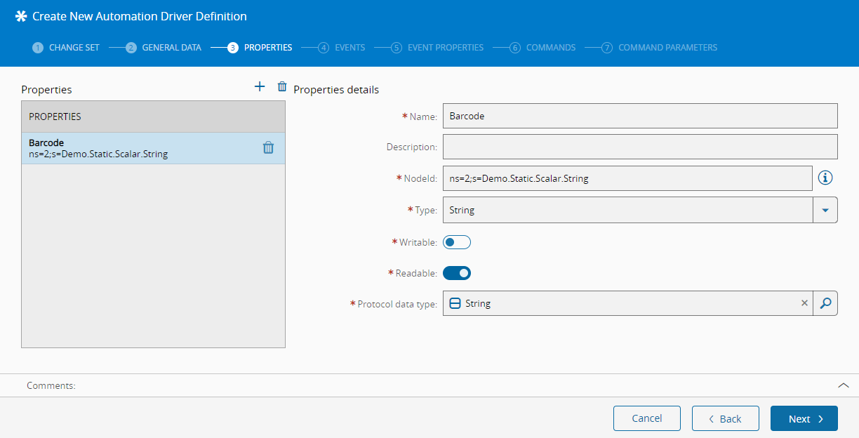 For the OnBarcodeRead event, add one new entry and select the Barcode property. Since no command will be created in the scope of this tutorial, we can jump over the Commands and Command Parameters panels and finish creating the Automation Driver Definition.