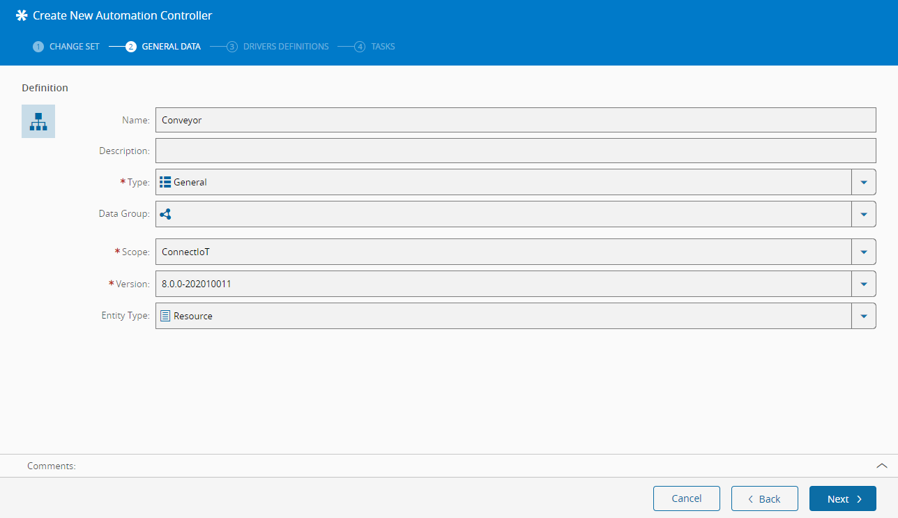 We are now ready to design an Automation Controller that can give us the actual logic workflow that will handle the received values from the barcode reading event and act on it accordingly. Let us create one controller per each scope type (ConnectIoT and Factory Automation) Navigating to the Business Data menu again, create a new Automation Controller and use the following values: