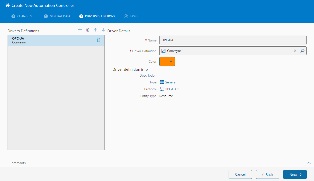 In the next panel, select the Automation Driver Definition created above. We can also select other driver definitions in order to enable connection to other machine types but in this case let's use the Conveyor driver definition created above, calling it "OPC UA Server". We will also select a different color for the tasks so that they can be easily distinguished in the workflow designer.