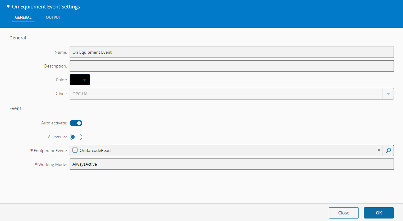 In this new page, we will drag the On Equipment Event task tile from the right hand side Tasks panel to the workflow canvas. You can search for any tile name using the search box. Editing the settings of the task, we will add the Automation Event that we have configured in the Automation Driver Definition. Since it is the only one we have configured, it will automatically populate the Output tab with the Barcode output value we also configured before. Notice that the Auto Activate property is active, so whenever the value of the property is changed, the controller task will be activated.