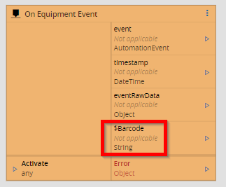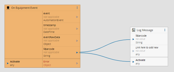 We can now link the Barcode property of OnEquipmentEvent that will hold the scanned Barcode and link it to the new API Post Event task, together with another link to activate the task.
