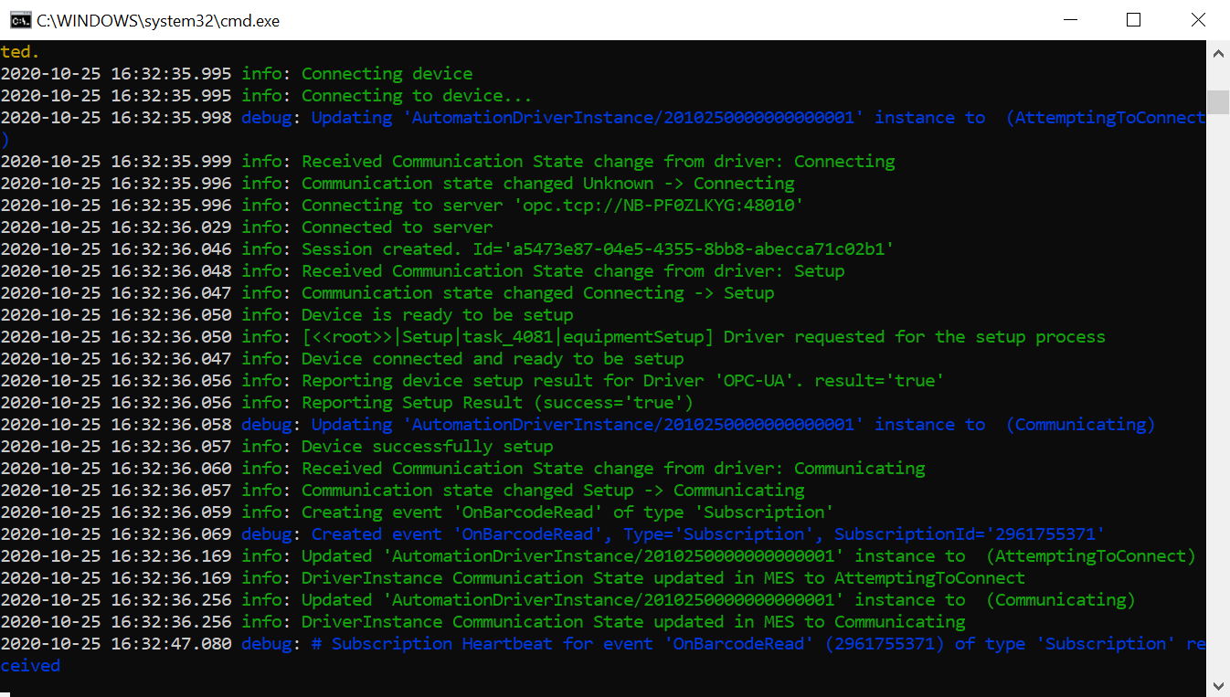 - When a barcode is read, the event is sent from the OPC-UA client and picked up by the