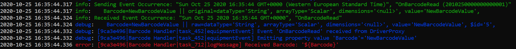 To test the connectivity, we will simulate a value being read by the Barcode Reader in out OPC-UA test client and change the property value to NewBarcodeValue. The value should be received by the Automation Manager since it has subscribed to any changes in that specific property and you can see that the logMessage entry from the LogMessage task being executed with the verbosity we specified, which in this case was error. The connection between a OPC-UA data source and the Connect IoT is then successfully established.