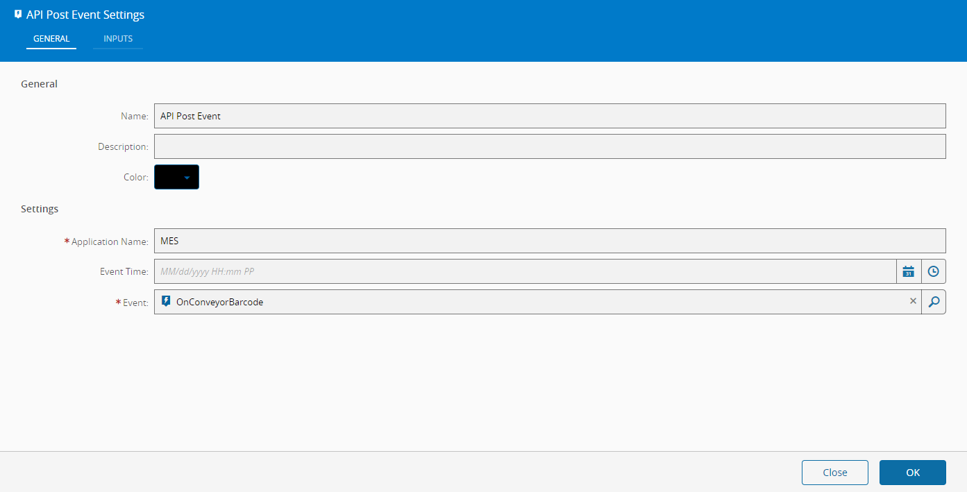 Now, to force our controller to actually send the event, let's post it every time the barcode is scanned. Going to the Automation Controller page, we will add a new task called API Post Event that will do just that. After dragging it to the canvas in the "Barcode Handler" page, we will edit the settings to select the OnConveyorBarcode event definition we just created as the Event property.
