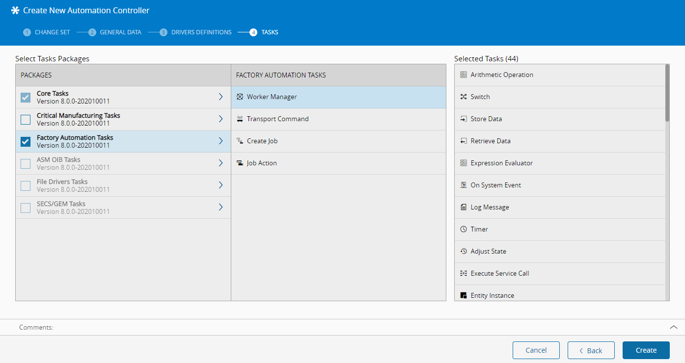In the Tasks page, the Core and Factory Automation are already pre-selected due to the scope of the Automation Controller and cannot be unselected. Select Create to complete the process.
