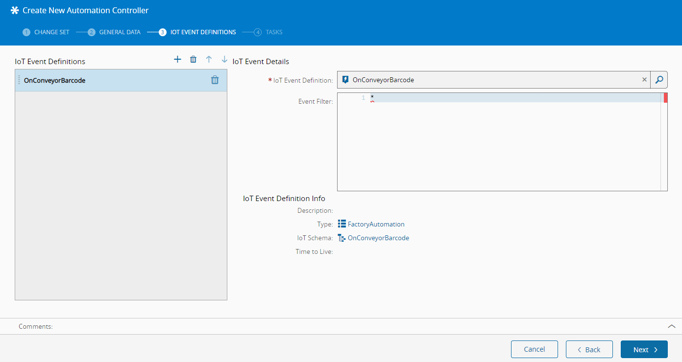 Since we changed the Scope to FactoryAutomation, instead of defining an event we will now be defining a IoT Event Definition. Select the OnConveyorBarcode we created earlier.