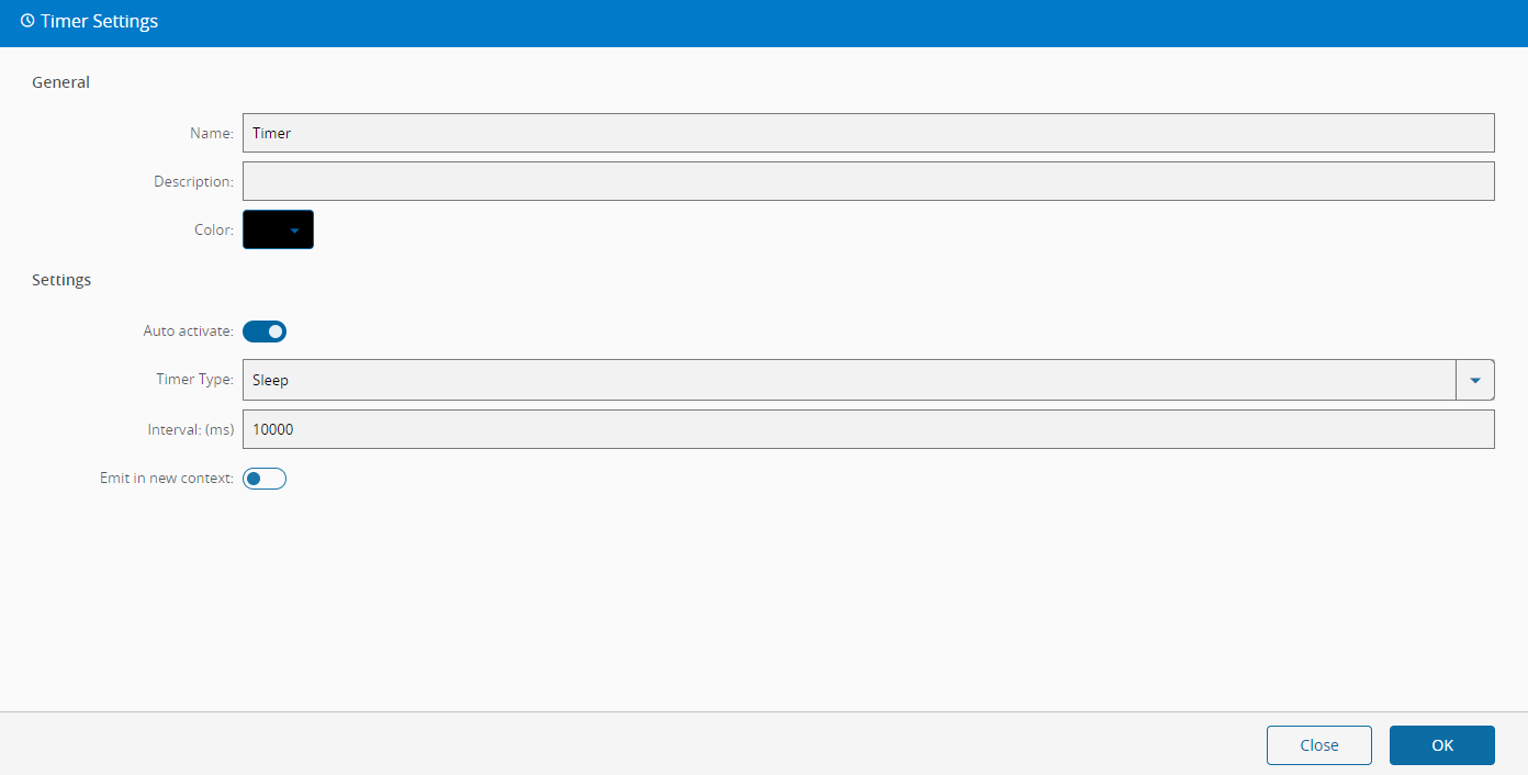 Since we already have the OnConveyorBarcode event definition selected, the Barcode property will be automatically added to the On Job Start task. Let us add some logging and a new Timer task to the canvas, configuring a sleep period of 10 seconds before doing anything. Link the Success and Error outputs of the Timer to the same inputs of the Job End task.