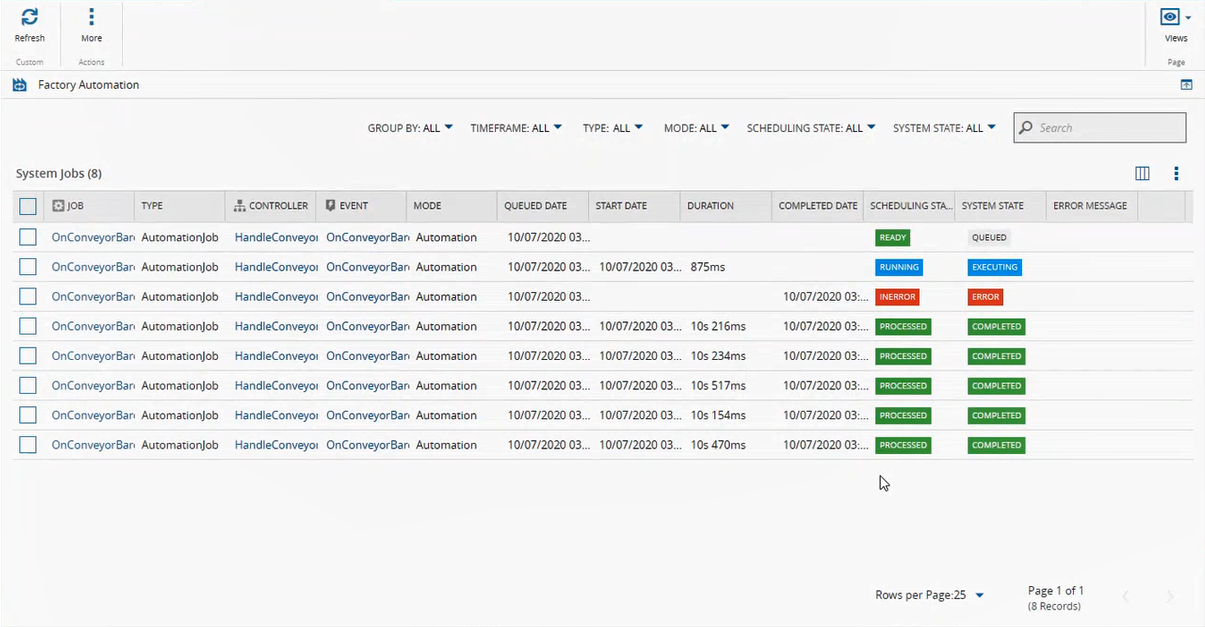 A list of jobs and their current status can be seen in the Factory Automation view, accessible from the main menu under Automation. If a job fails, that job can be restarted from this same page, using the buttons on the top ribbon.