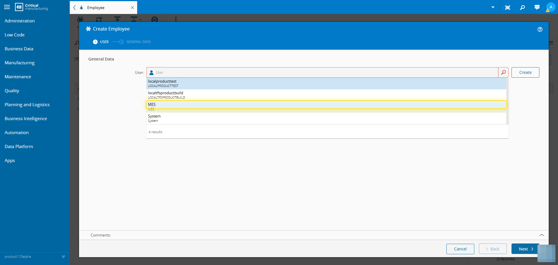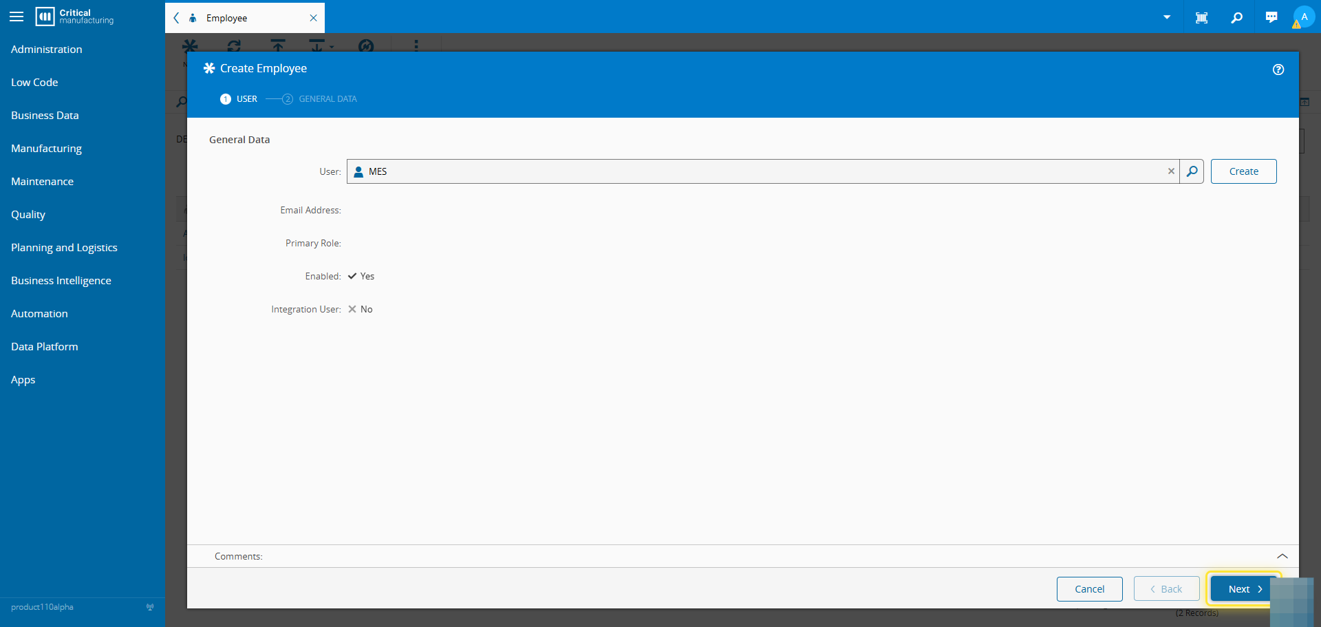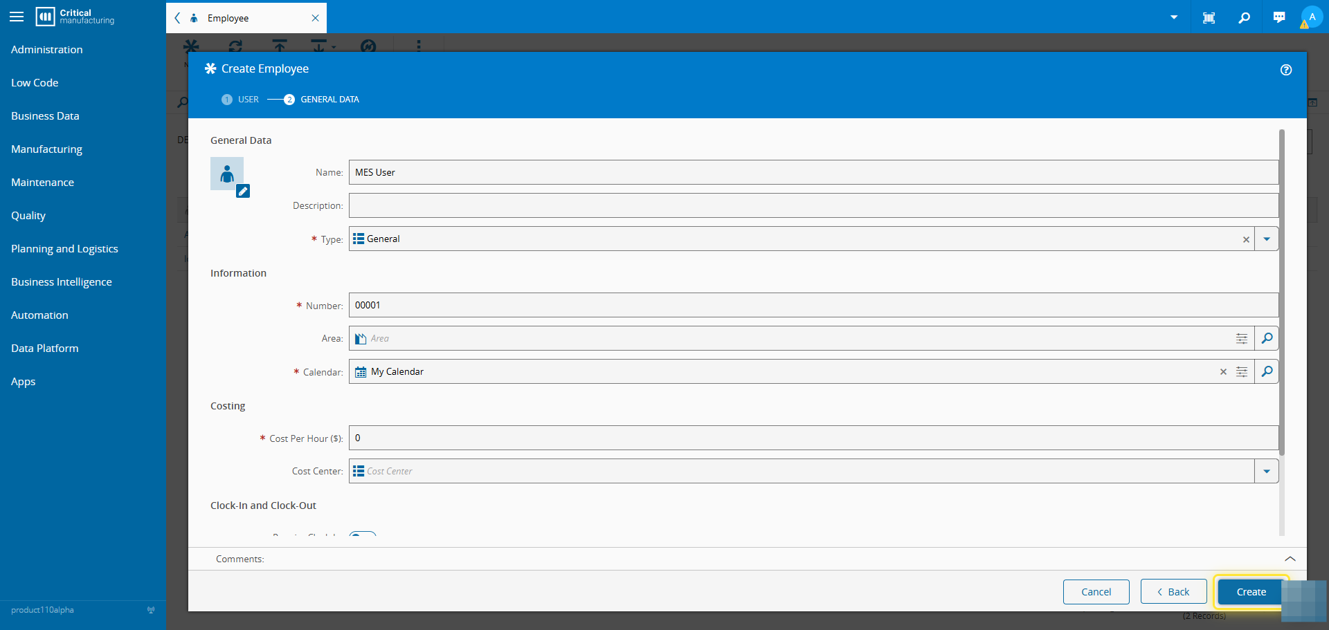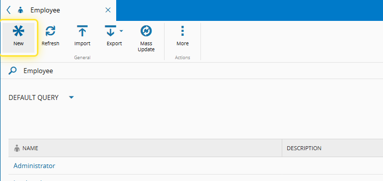 How to: Create an Employee# 1. Go to the Business Data menu.# 2. Select the Employee entity.# 3. Select the New button.# 4. Add the User information.# 5. Select the Next button.# 6. Set the General Data of the Employee.# 7. Select the Create button.#
