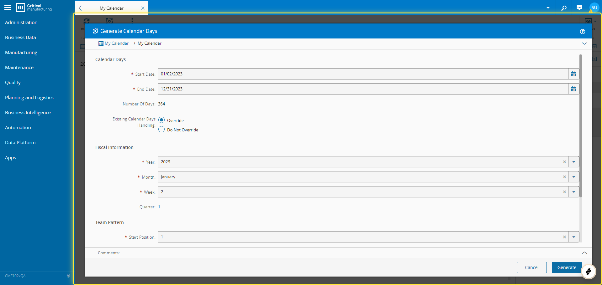 For more information, see Generate Calendar Days - Critical Manufacturing Documentation Portal ⧉