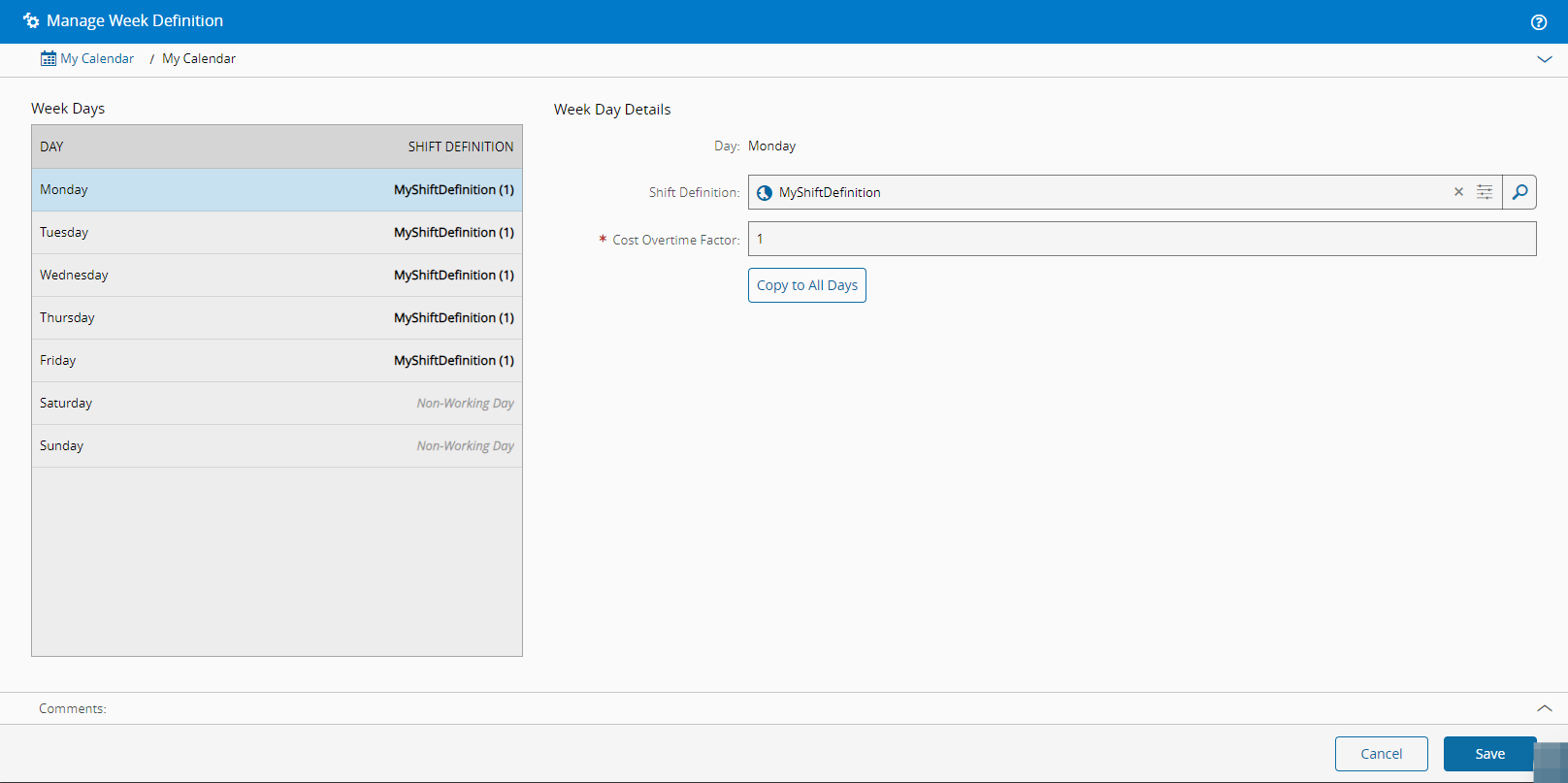 For more information, see Calendar Page - Critical Manufacturing Documentation Portal ⧉