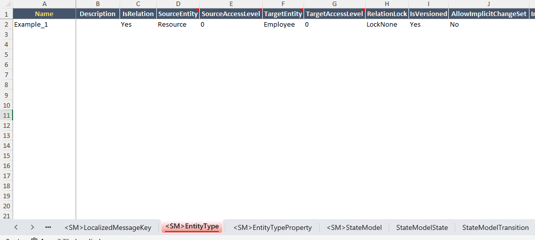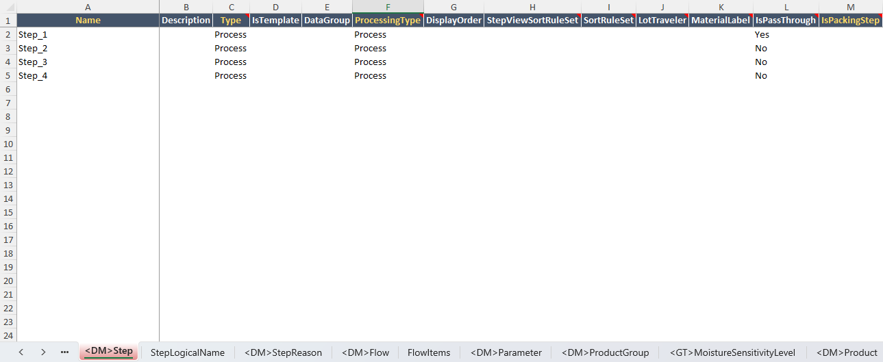 The name of the Excel sheets must match the MES entities being loaded and the name of the columns must match the entity properties exactly. When processing the data, the system will check if the object already exists, thus creating or updating it accordingly.