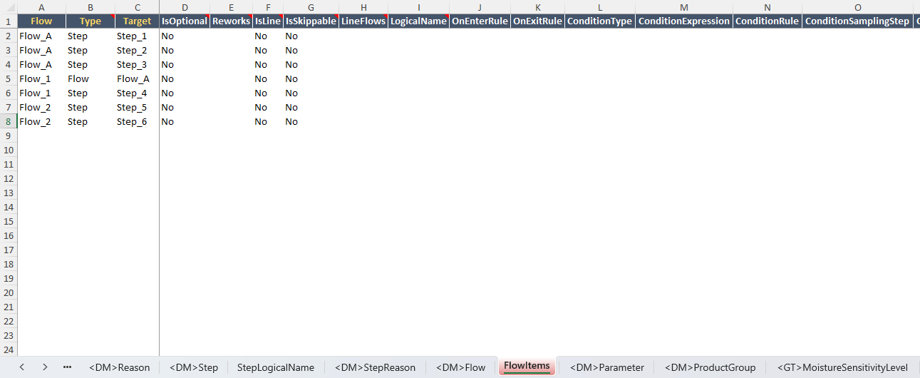 3. Utilize the FlowItems sheet to create the desired Flow structure.